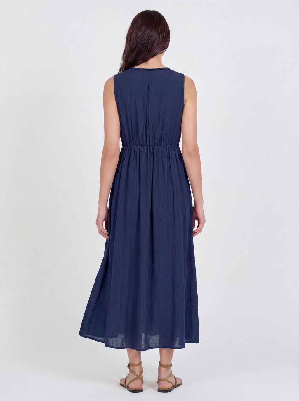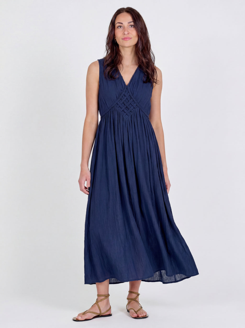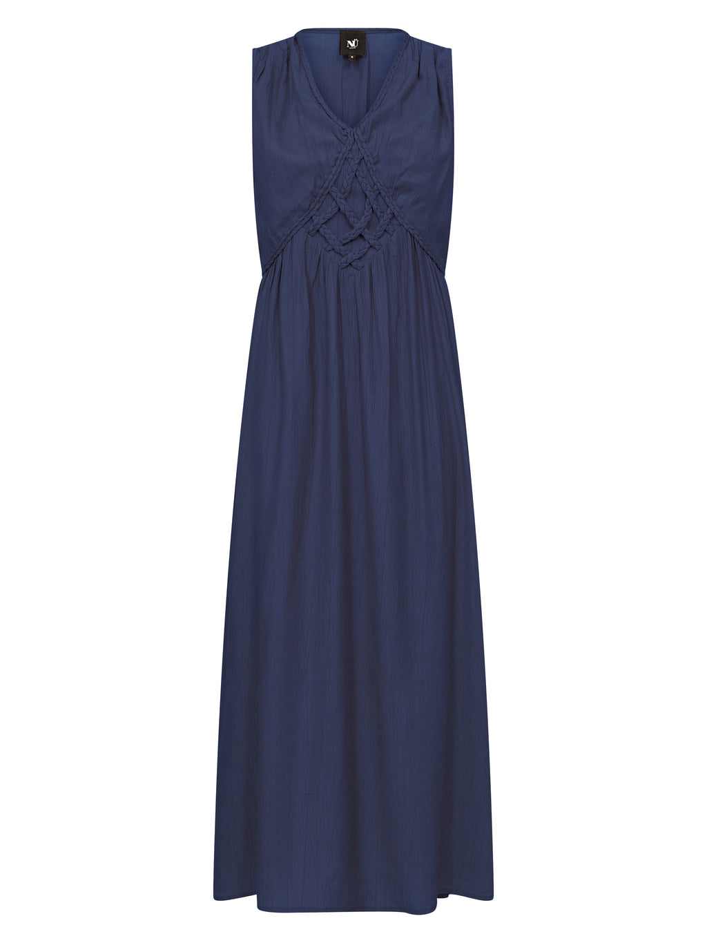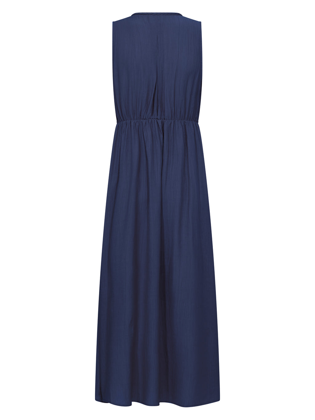 Denne kjole er lavet i en let viskoseblanding med en crepet struktur, der giver et smukt fald og en behagelig følelse. Den ærmeløse silhuet og V-udskæringen skaber et feminint og afslappet udtryk. Foran tilfører den flettede og knyttede detalje et råt og samtidig elegant element, mens elastikken bagtil sikrer en fleksibel pasform. Bagtil holdes designet enkelt med et let fald.