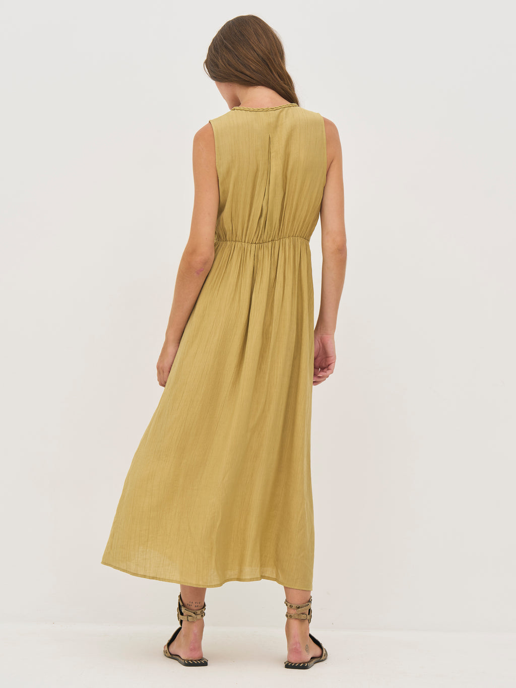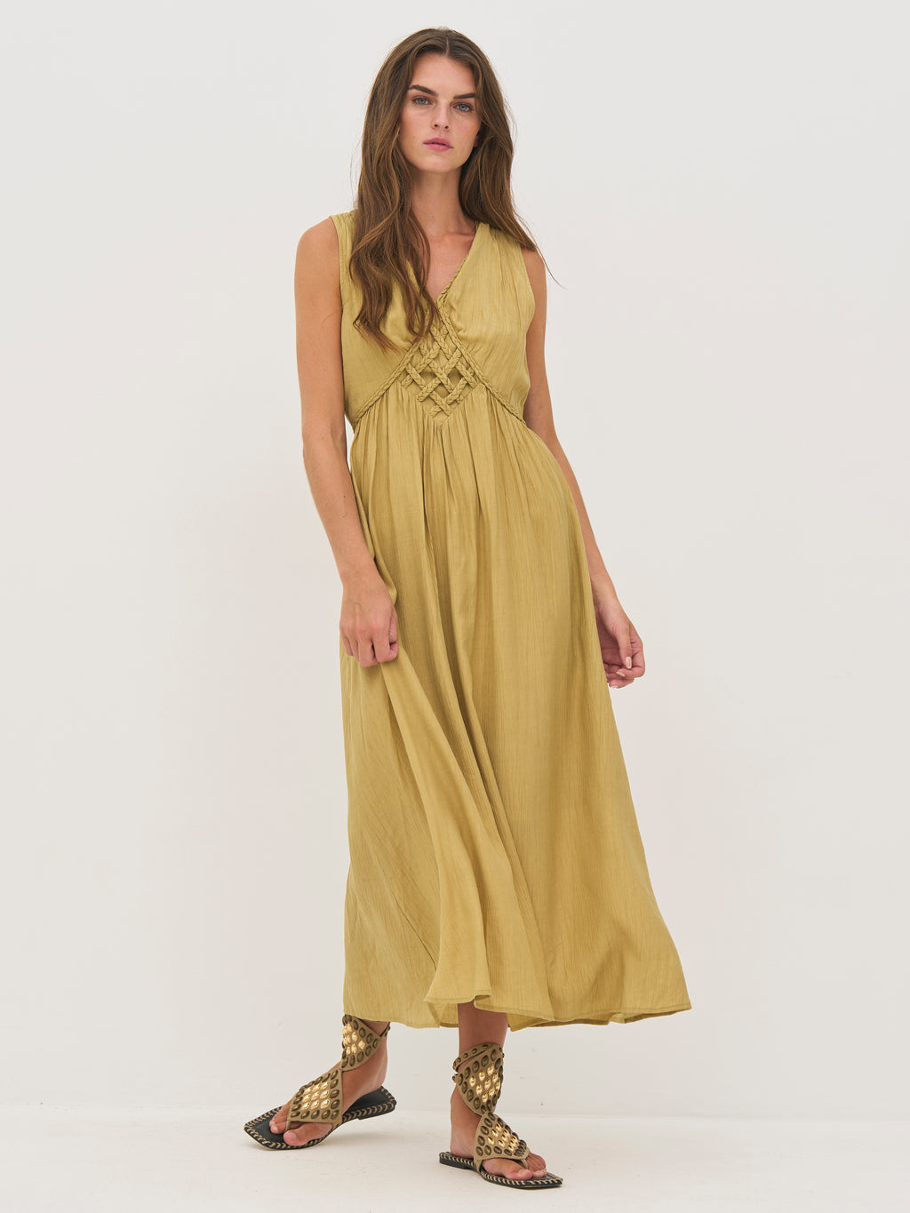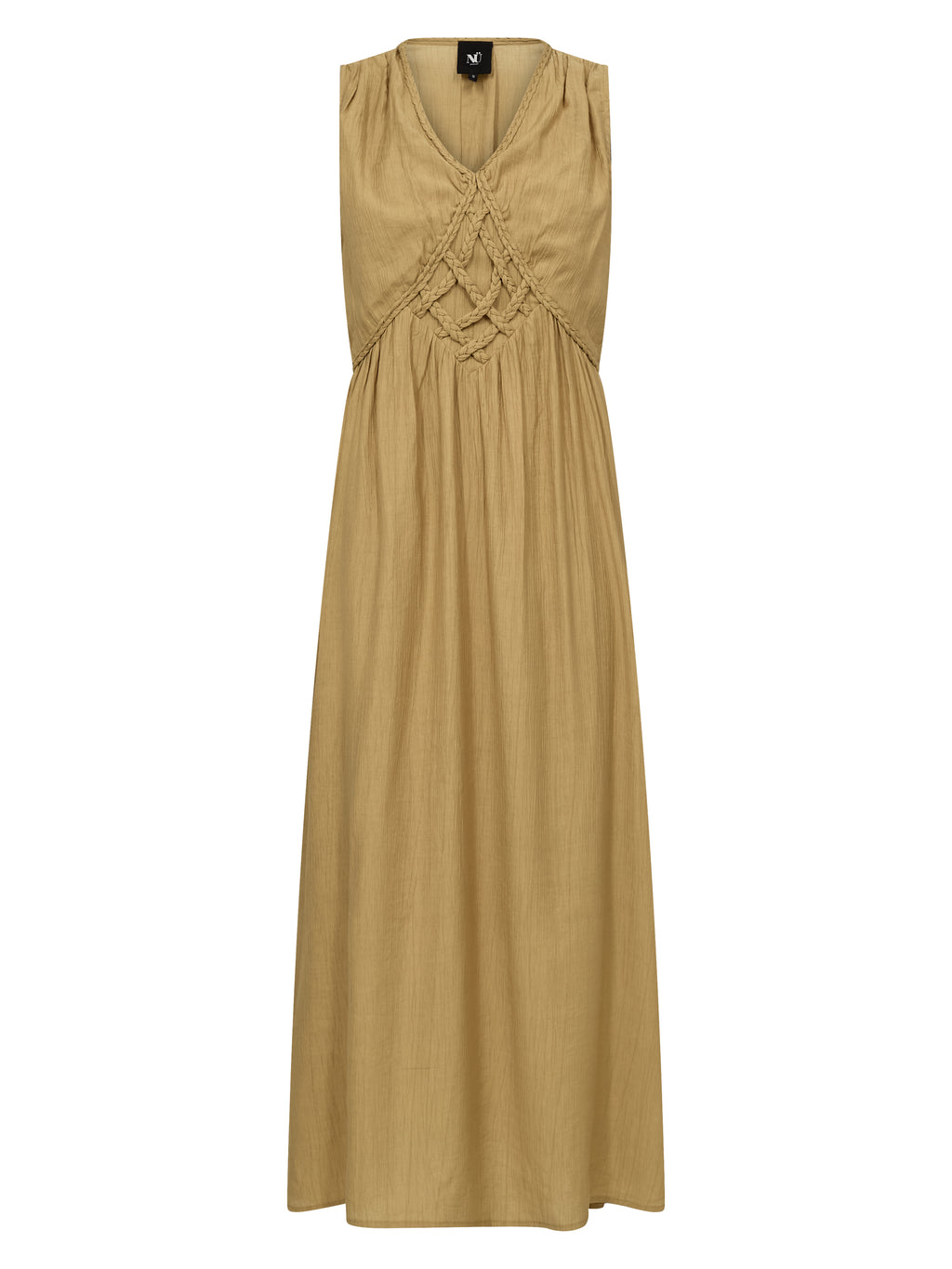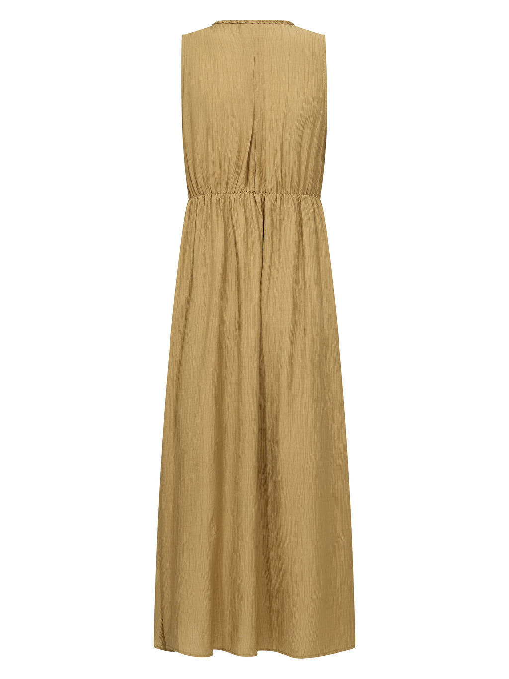 Denne kjole er lavet i en let viskoseblanding med en crepet struktur, der giver et smukt fald og en behagelig følelse. Den ærmeløse silhuet og V-udskæringen skaber et feminint og afslappet udtryk. Foran tilfører den flettede og knyttede detalje et råt og samtidig elegant element, mens elastikken bagtil sikrer en fleksibel pasform. Bagtil holdes designet enkelt med et let fald.