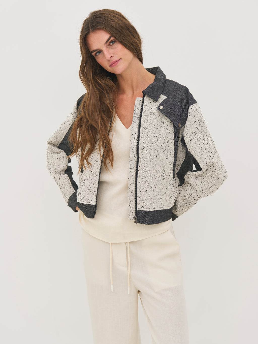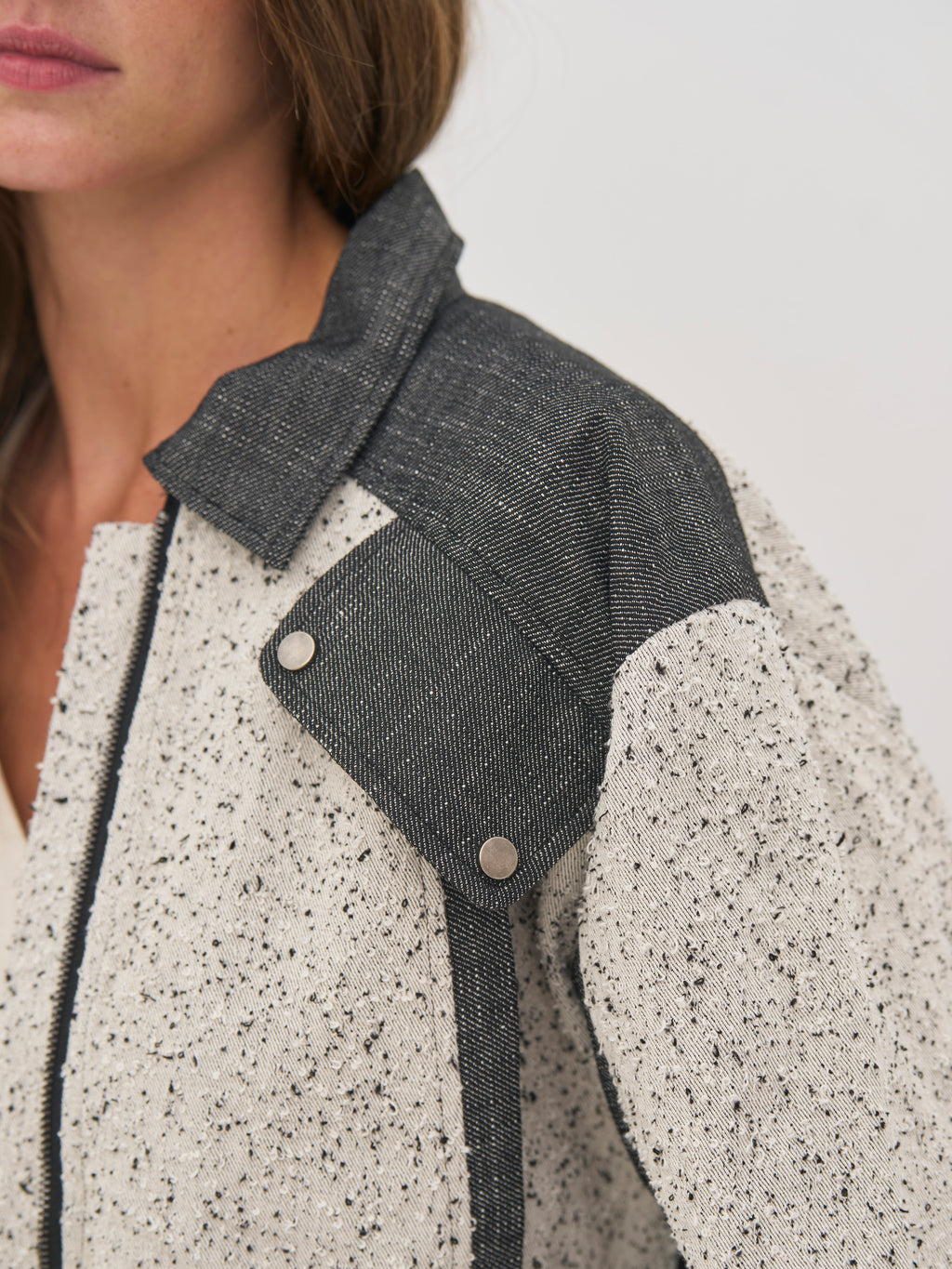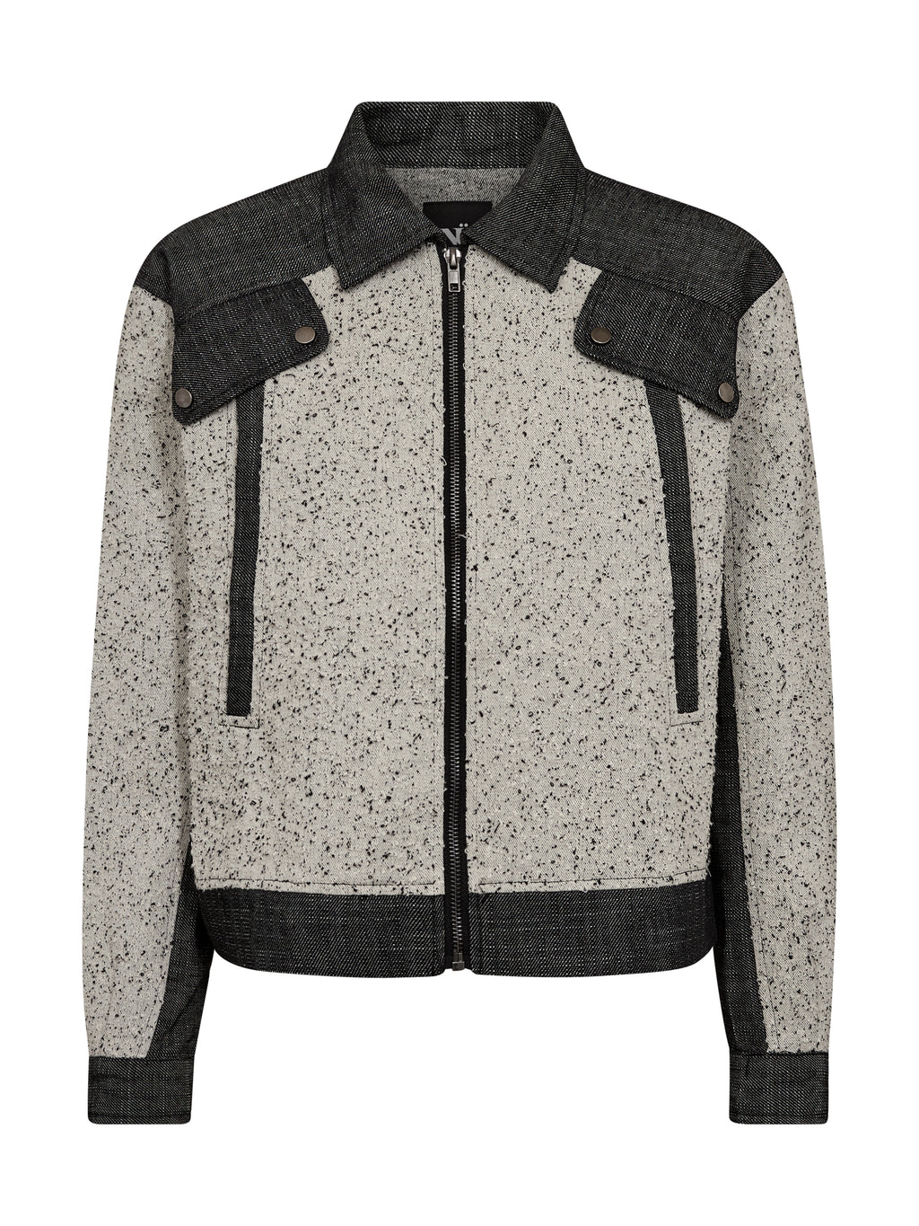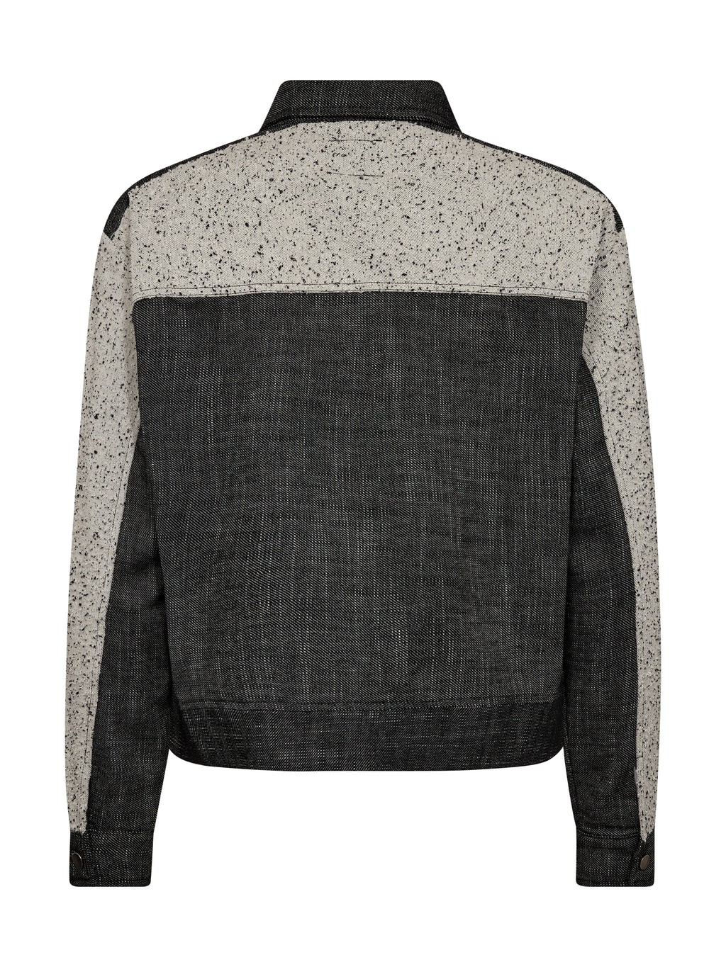 Denne jakke er designet i en kombination af struktureret bomuld og groft vævet bomulds- og hørkvalitet, som giver et spændende og taktilt udtryk. Det tofarvede design med meleret front og mørkere paneler skaber en flot kontrast og tilfører kant til looket.