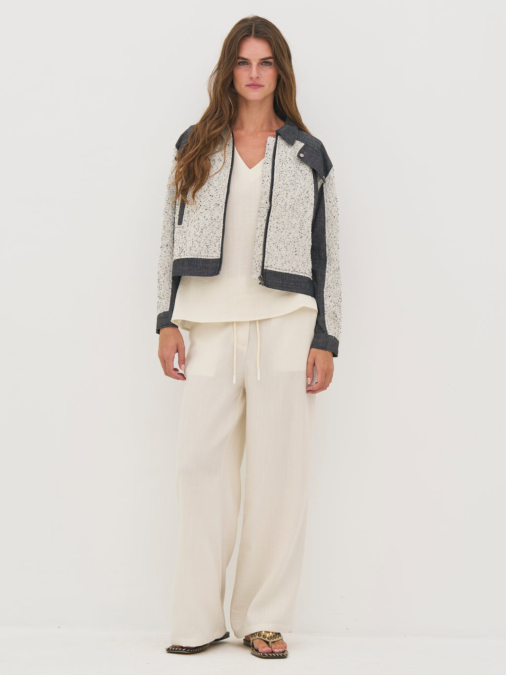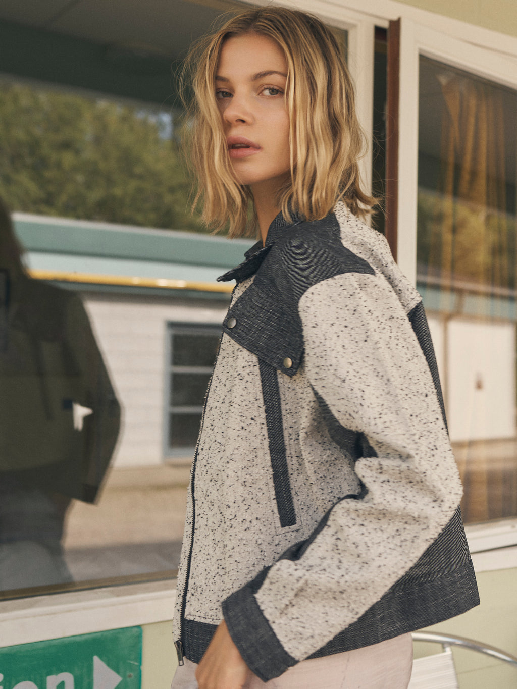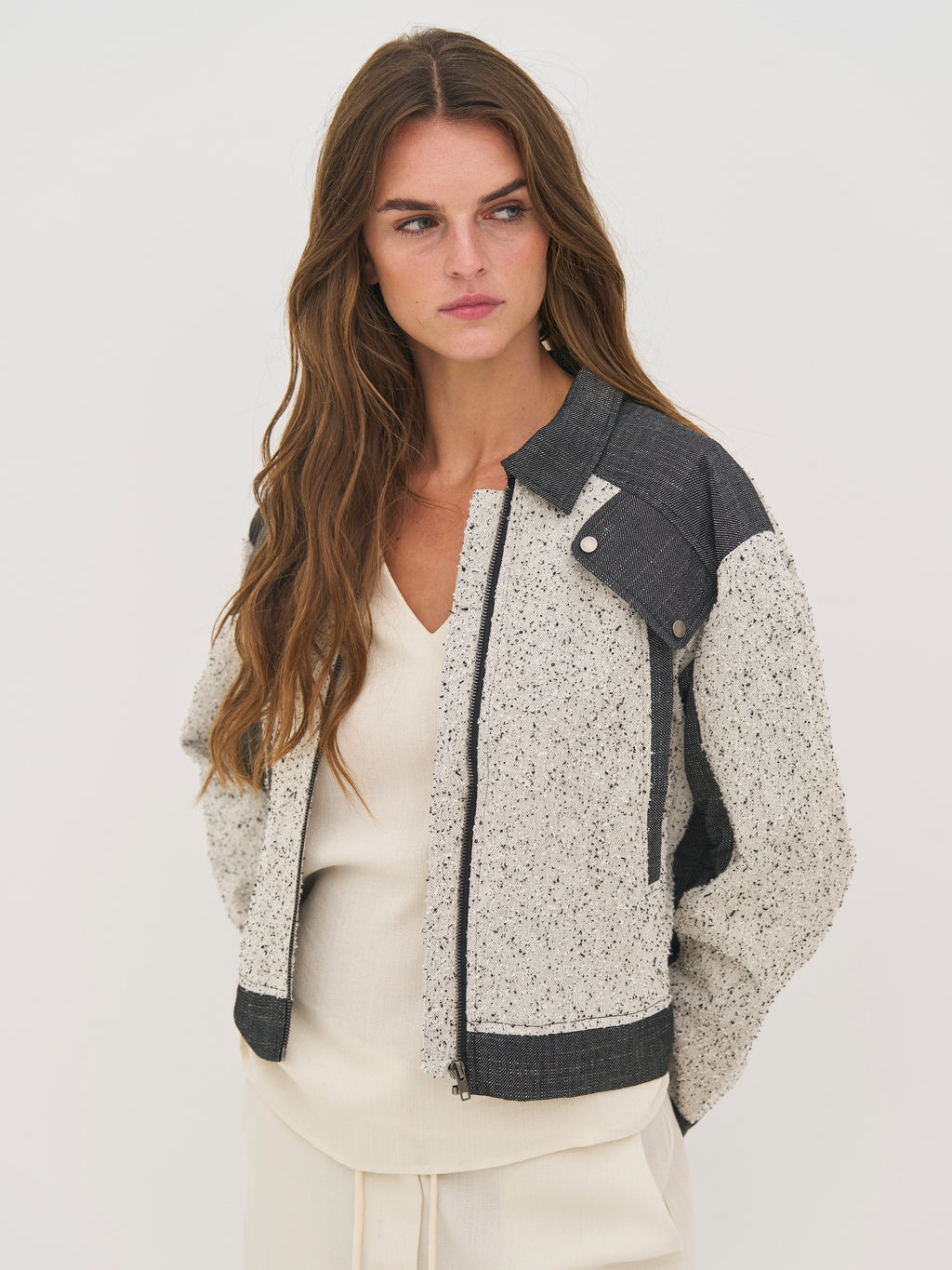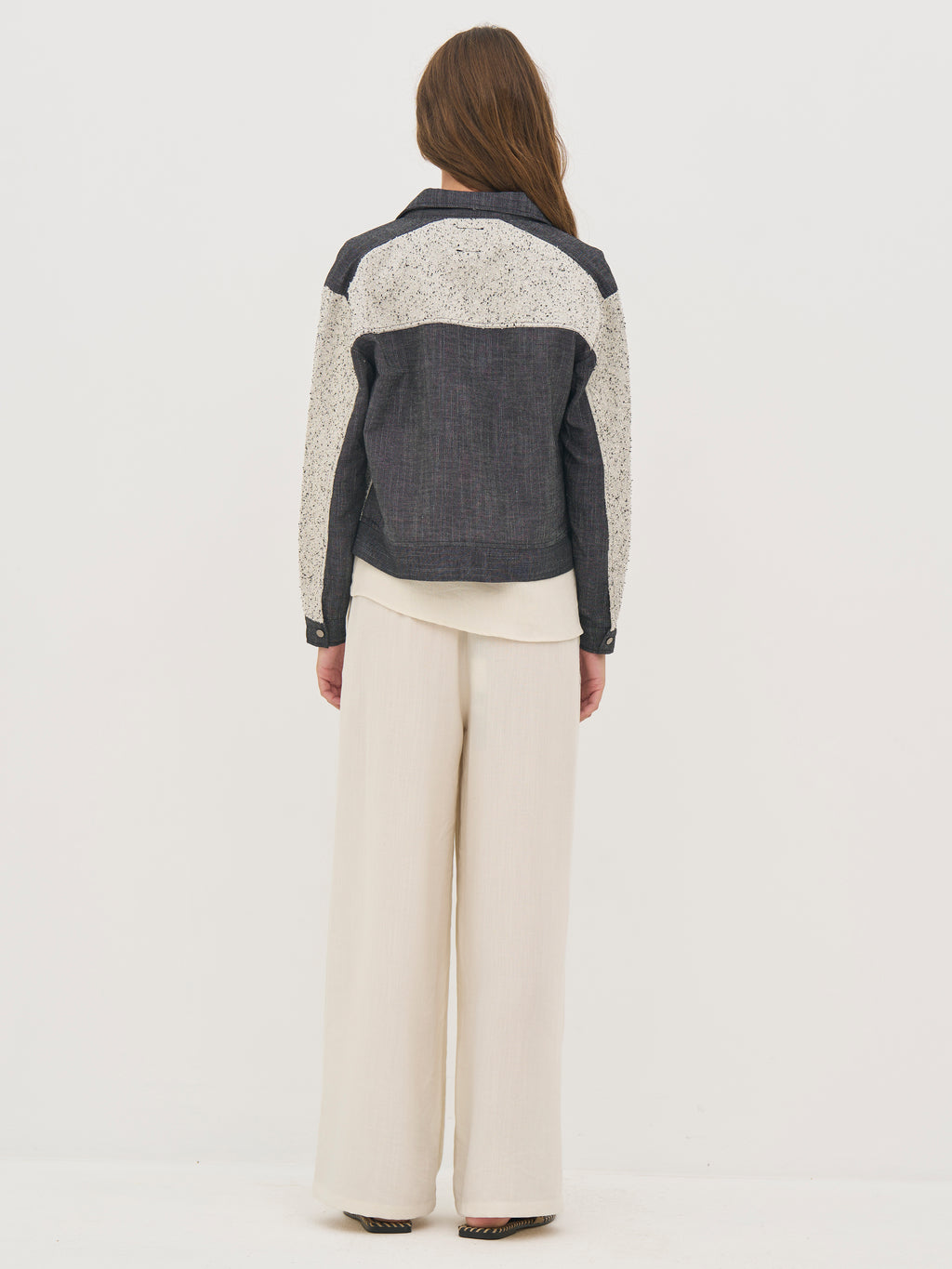 Denne jakke er designet i en kombination af struktureret bomuld og groft vævet bomulds- og hørkvalitet, som giver et spændende og taktilt udtryk. Det tofarvede design med meleret front og mørkere paneler skaber en flot kontrast og tilfører kant til looket.