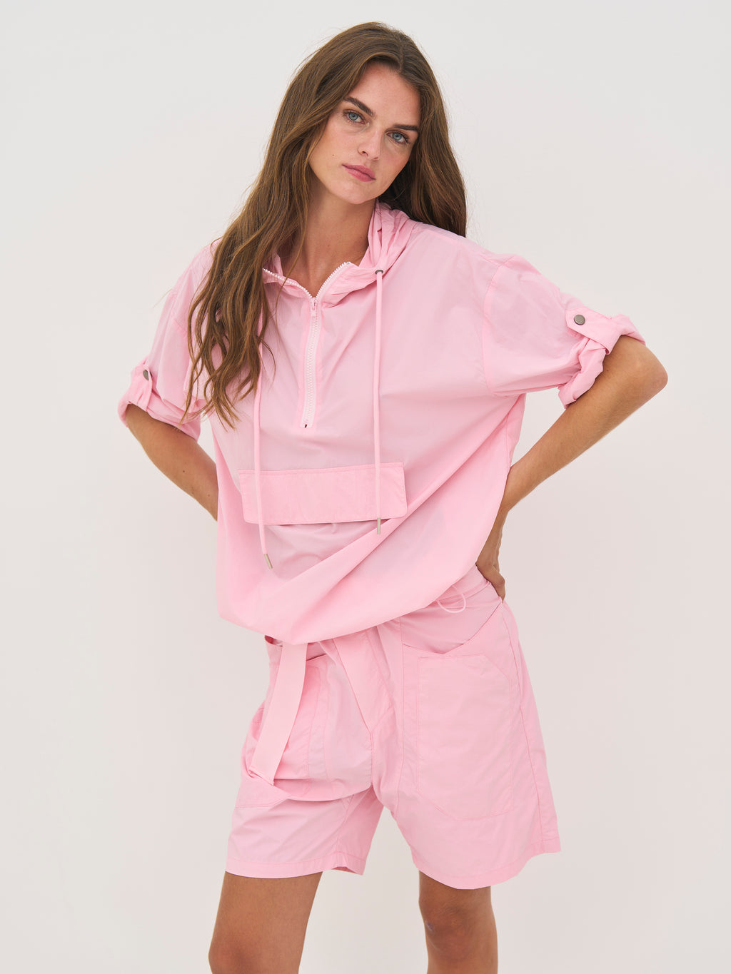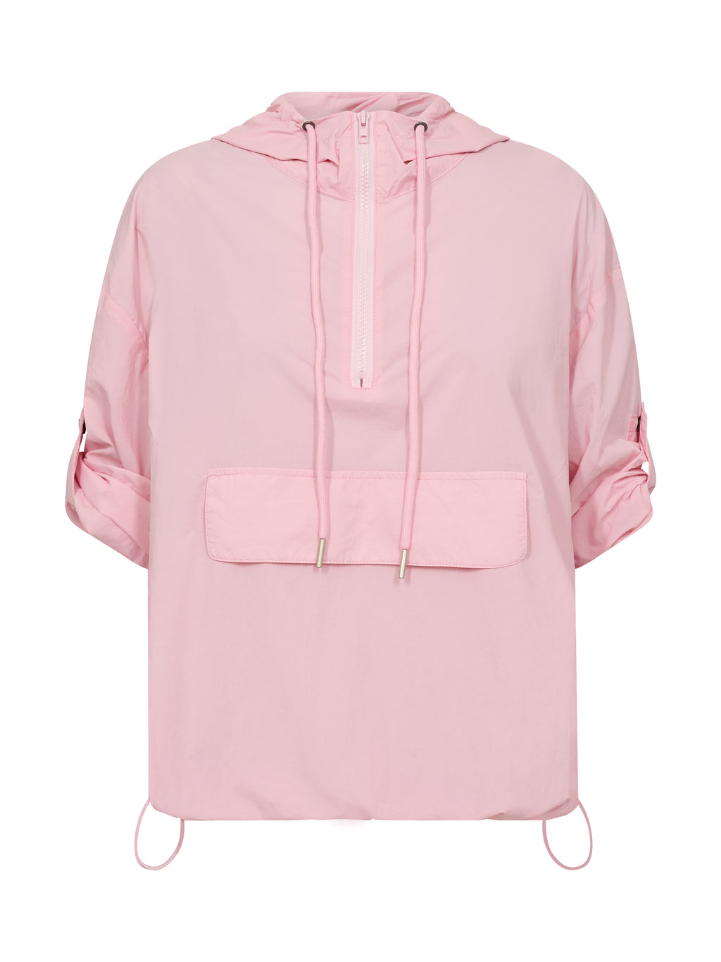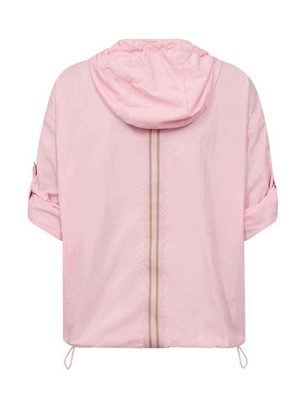 Denne bluse har et let og luftigt udtryk, der gør den ideel til lag-på-lag i overgangsperioder. Den er designet med en halv lynlås og hætte med snøre, som tilfører et sporty og funktionelt præg. Ærmerne kan justeres og fastgøres med strop og trykknap, hvilket giver fleksibilitet i udtrykket. Den elastiske snøre forneden gør det muligt at tilpasse pasformen, mens stribedetaljen bagtil giver en diskret kontrast.