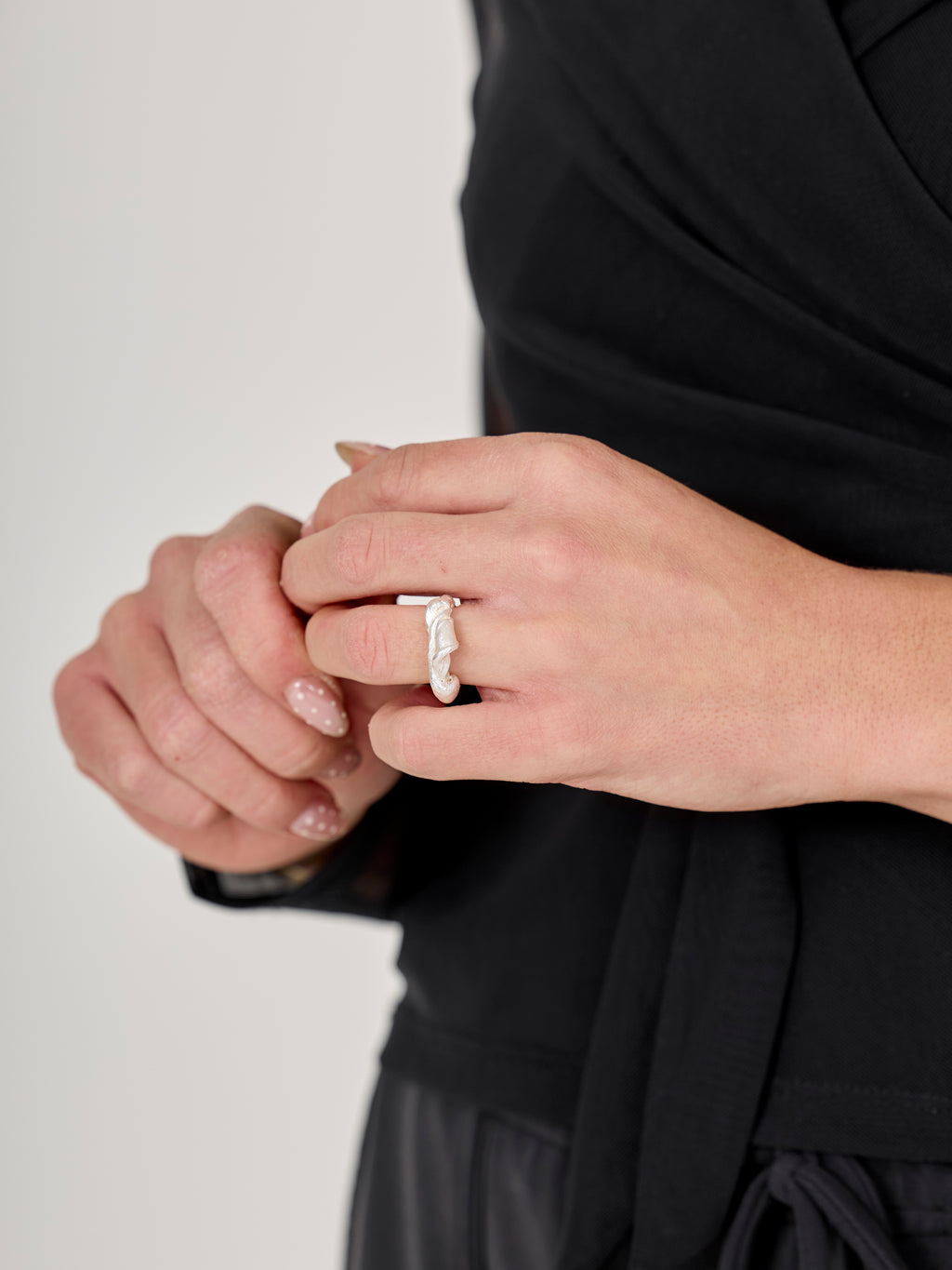 Den åbne form giver ringen et let og levende udtryk, mens overfladen tilfører karakter og dybde. Den føles skulpturel, men samtidig naturlig at bære.