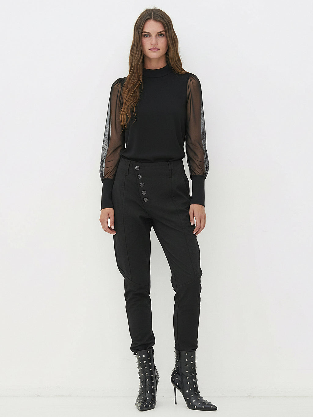 Oplev den raffinerede elegance med vores langærmede bluse, hvor mesh-ærmer møder brede cuffs og en diskret krave. Denne tidløse bluse kan styles op med en sofistikeret nederdel for et aftenlook eller ned med jeans til en mere casual anledning.