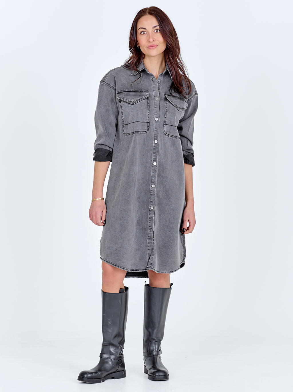 Vores langærmede cowboykjole er et alsidigt valg som nemt kan styles op eller ned til forskellige lejligheder. For et enkelt hverdagsoutfit, style da kjolen med flade sko og en fin skuldertaske. For et mere formelt event, kan du matche den med høje hæle og en elegant clutch, for at opnå et raffineret, men stadig afdæmpet udtryk.