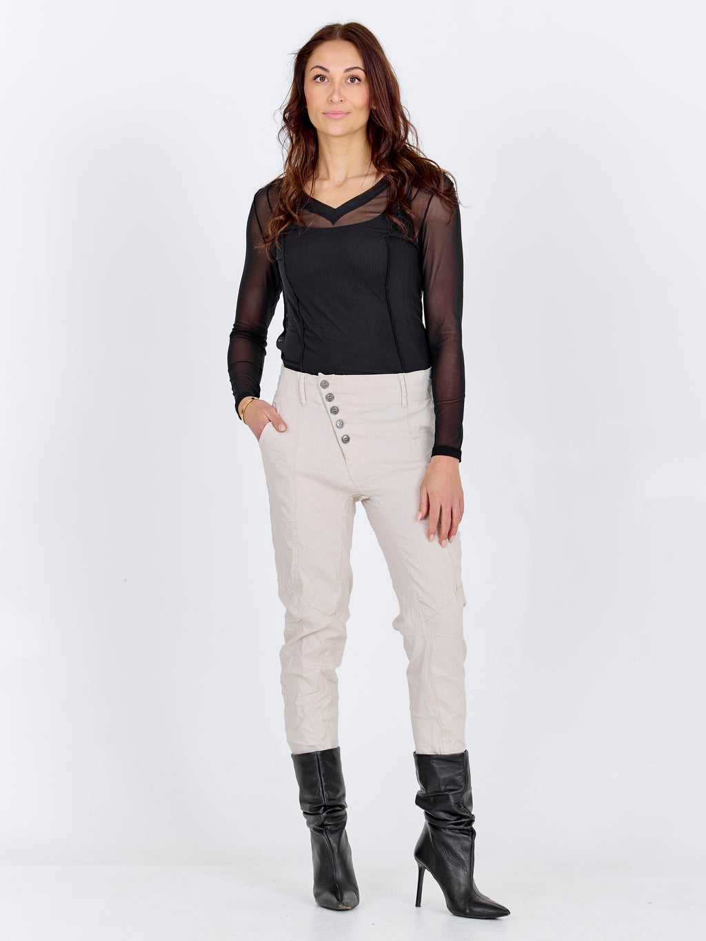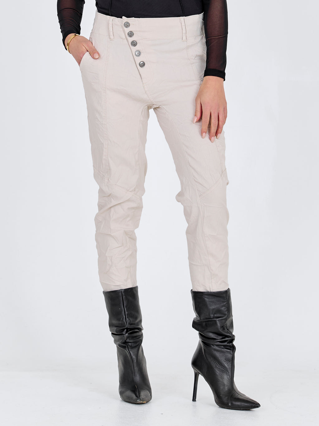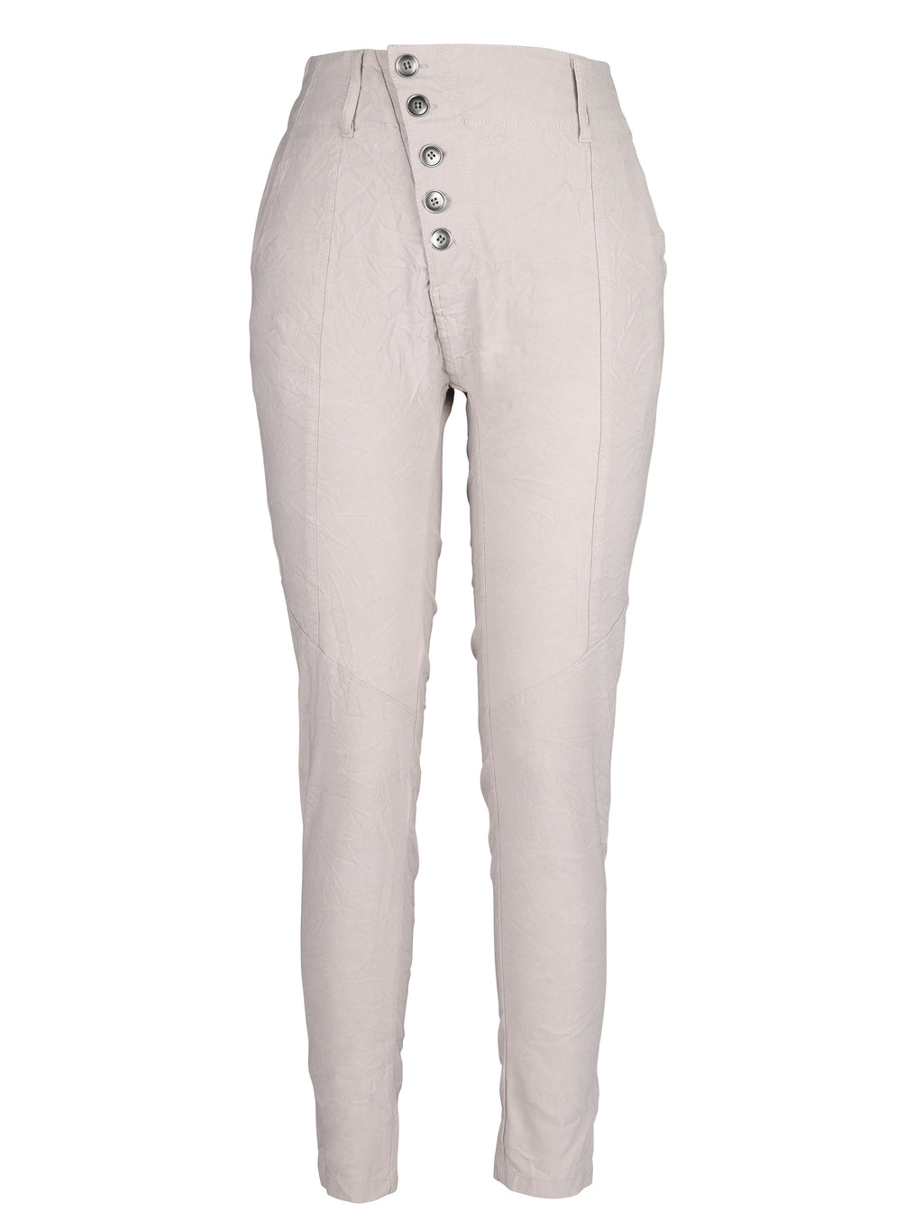 Disse bukser er perfekte til både formelle og afslappede begivenheder. For et sofistikeret hverdagslook, prøv at kombinere dem med en skjorte og enkelte smykker. Buksernes sidelommer giver dem et praktisk touch, mens den unikke knaplukning foran tilføjer et moderne twist.